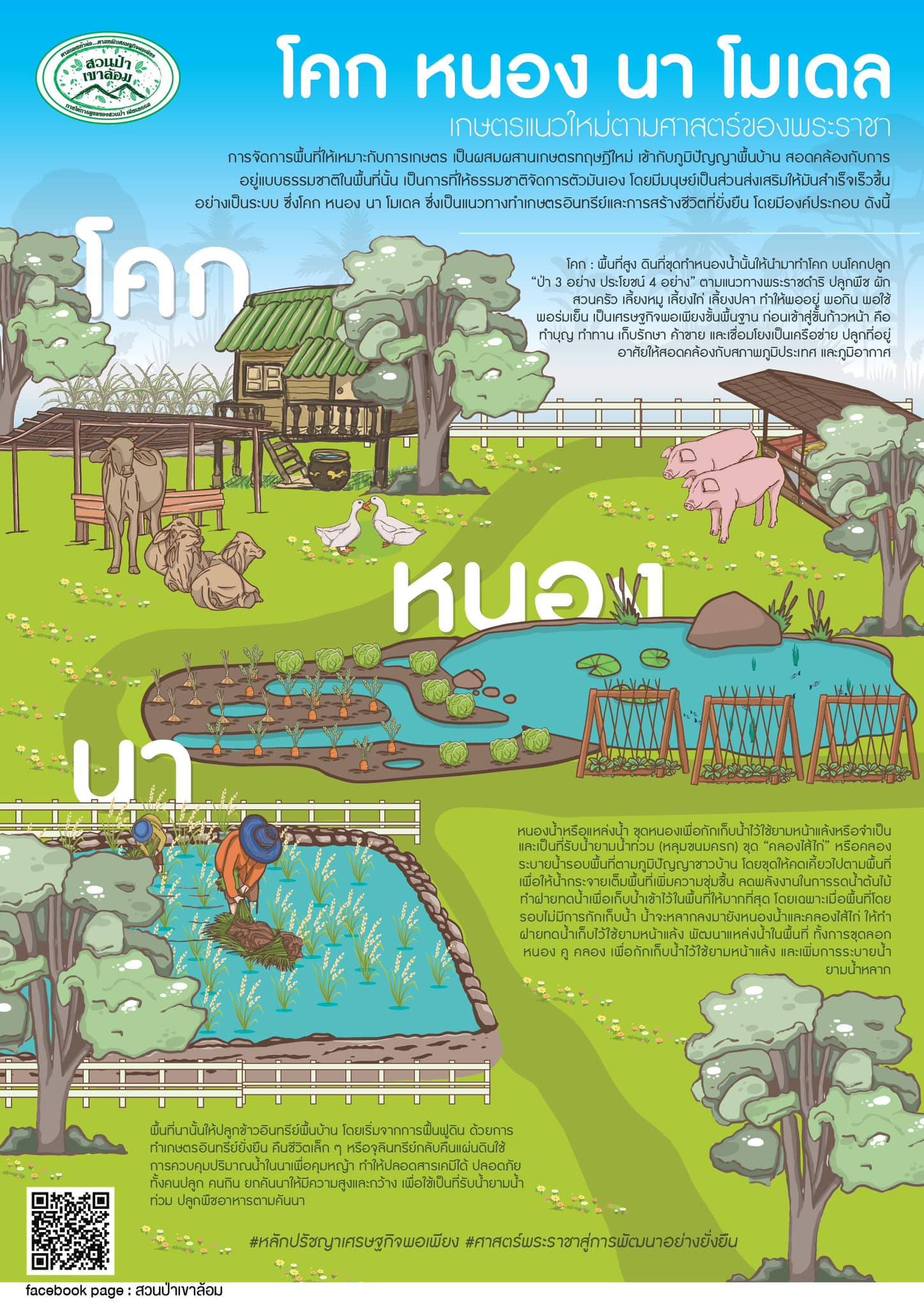 เกษตรแนวใหม่ตามศาสตร์ของพระราชา การจัดการพื้นที่ให้เหมาะกับการกษตร เป็นผสมผสานเกษตรทฤษฎีใหม่ เข้ากับภูมิปัญญาพื้นบ้าน สอดคล้องกับการอยู่แบบธรรมชาติในพื้นที่นั้น เป็นการที่ให้ธรรมชาติจัดการตัวมันเอง โดยมีมนุษย์เป็นส่วนส่งเสริมให้มันสำเร็จเร็วขึ้นอย่างเป็นระบบ ซึ่งโคก หนอง นา โมเดล ซึ่งเป็นแนวทางทำเกษตรอินทรีย์และการสร้างชีวิตที่ยั่งยืน โดยมีองค์ประกอบ ดังนี้